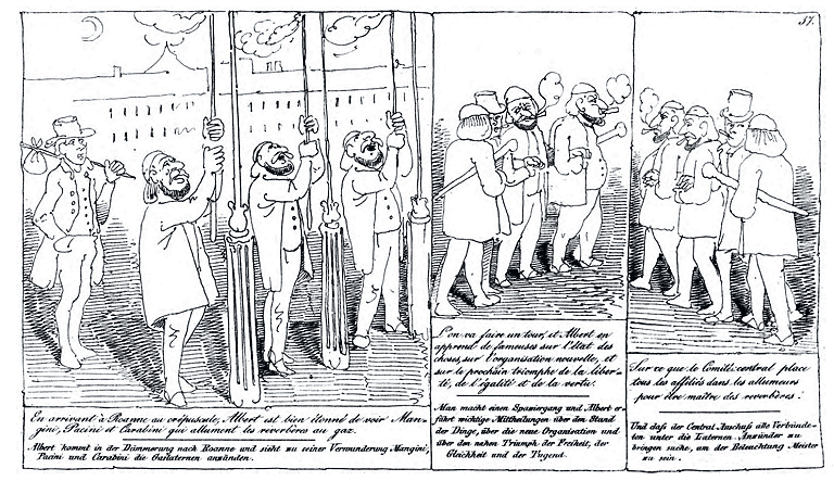 | En arrivant à Roanne au crépuscule, Albert est bien étonné de voir Mangini, Pacini et Carabini qui allument les réverbères au gaz. | L'on va faire un tour, et Albert en apprend de fameuses sur l'état des choses, sur l'organisation nouvelle et sur le prochain triomphe de la liberté, de l'égalité et de la vertu. | Sur ce que le Comité central place tous les affiliés dans les allumeurs pour être maître des réverbères. |