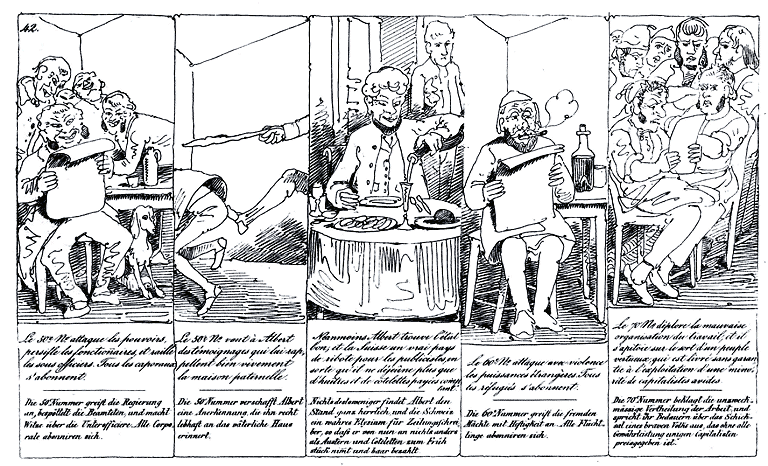 | Le 50e Nº attaque les pouvoirs, persifle les fonctionnaire, et raille les sous-officiers. Tous le caporaux s'abonnent. | Le 50e Nº vaut à Albert des témoignages qui lui rappellent bien vivement la maison paternelle. | Néanmoins Albert trouve l'état bon; et la Suisse un vrai pays de ribote pour les publicistes, en sorte qu'il ne déjeune plus que d'huîtres et de côtelettes payées comptant. | Le 60e Nº attaque avec violence les puissances étrangères. Tous les réfugiés s'abonnent. | Le 70e Nº déplore la mauvaise organisation du travail, et il s'apitoie sur le sort d'un peuple vertueux, qui est livré sans garantie à l'exploitation d'une minorité de capitalistes avides. |