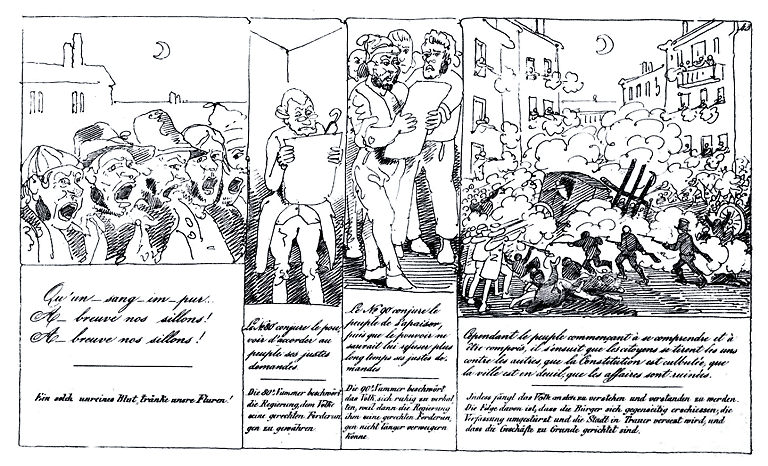 | Arrivés sur le sol Helvétique, les quatre amis saluent avec ivresse cette terre de liberté. | Et entrés dans le chef-lieu, ils fraternisent avec les publicistes de l'endroit. |