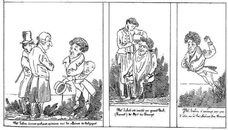| Mr. Jabot énonce quelques opinions sur les affaires de Belgique. | Mr. Jabot est invité au grand bal, (Raout) de Mme du Bocage. | Mr. Jabot s'essaye au pas d'été, et à la chaîne des dames. |