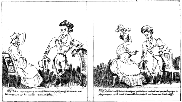 | Mr. Jabot énonce diverses pensées et observations sur l'usage du monde, sur les exigences de la civilité, et sur les galopes. | Mr. Jabot croit devoir témoigner par sa pose, autant que par un léger jeu de physionomie, qu'il saisit à merveille la pensée d'une dame qui s'embrouille. |