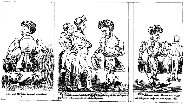 | Mr. Jabot change d'oeil vers 2 heures, après nécessité. | Cependant les seconds de Mr. Jabot et de ses adversaires s'assemblent de bon matin. Un premier propose le Pistolet. -- Arrêté. -- Un second, que l'on charge les armes avec deux boulettes de mie de pain, puisque l'honneur sera également satisfait. -- Arrêté comme juste et conforme à l'usage. -- Un troisième que l'on en prévienne les parties; afin de leur épargner une inquiétude inutile. -- Adopté à l'unanimité. | Mr. Jabot devant tirer le dernier, essuie noblement le premier feu. |