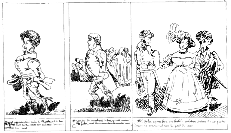 | Les propos étant peu goûtés, Mr. Jabot croit devoir approprier des gestes de bon goût à ses expressions choisies. | Les expressions ayant peu d'effet, Mr Jabot croit devoir se renfermer dans une attitude décélant l'observation fine et la plaisanterie de bon ton. | Après quoi, Mr Jabot conduit la galope avec le plus heureux succès. |