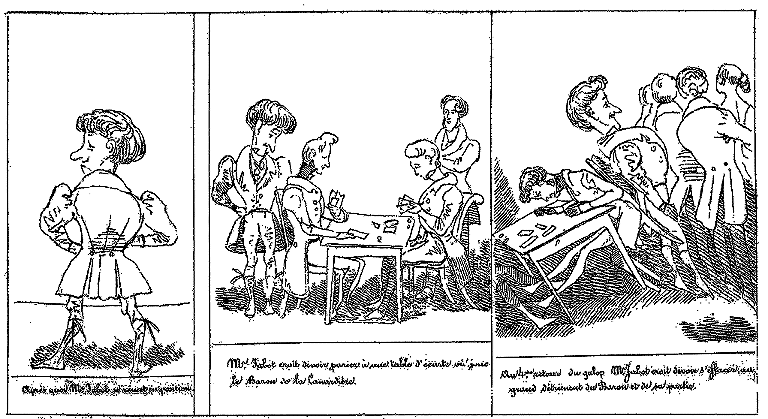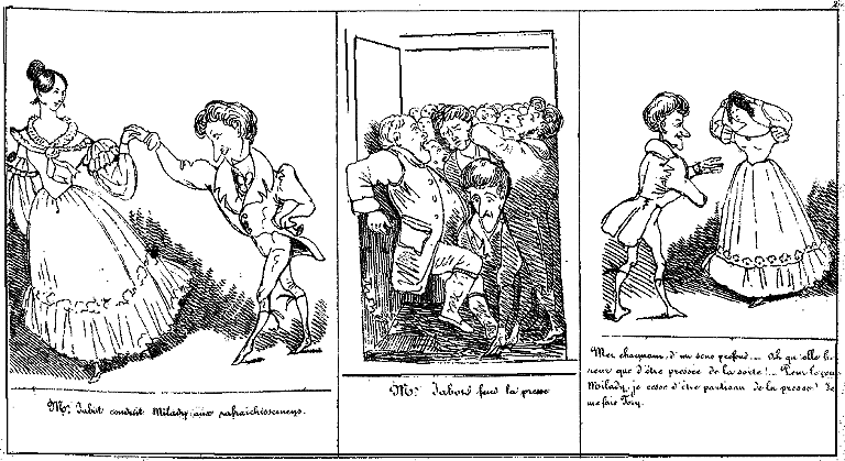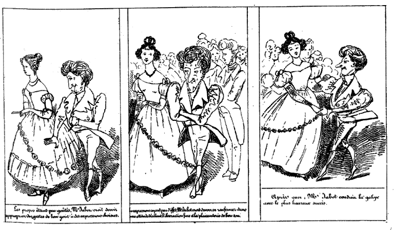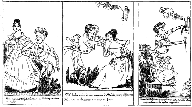 | Beau moment! Mr. Jabot fait faire à Milady un tour de salle. | Mr. Jabot croit devoir marquer à Milady une préférance délicate. Un lampion s'éteint et fume. | Aussitôt Mr Jabot s'empresse de rémédier à cette odeur importune. -- Le galop approche. |