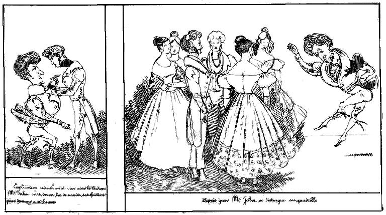 | Explication extrêmement vive avec le Baron. Mr. Jabot croit devoir lui demander satisfaction pour demain à 10 heures. | Après quoi Mr. Jabot se distingue au quadrille. |