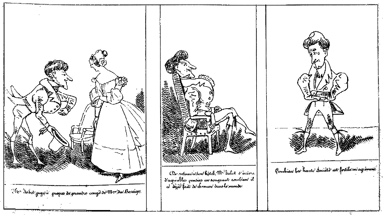 | Combien il a été heureux en impayables réparties. | Combien Milady fut aimable et son tendre intérêt visible!!! | Et cinq affaires d'honneur!!! quel début brillant! | Mr. Jabot fais ses dispositions testamentaires, écrit à Milord pour qu'il lui serve de second, et au chirurgien pour qu'il se trouve prêt. |
