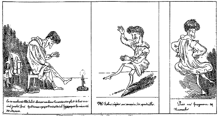 | En se couchant Mr. Jabot observe combien la nature se plut à lui créer une jambe fine. Quel dommage que l'ordre social lui impose la nécessité des vêtements. | Mr. Jabot répète un souvenir de quadrille. | Puis un fragment de Masourke! |