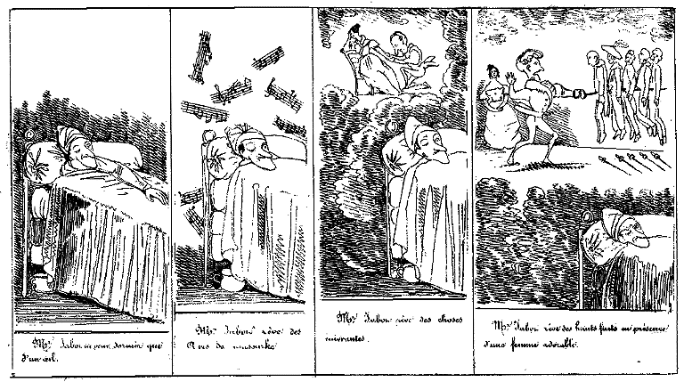 | Mr. Jabot ne peut dormir que d'un oeil. | Mr. Jabot rêve des airs de masourke. | Mr. Jabot rêve de choses enivrantes. | Mr. Jabot rêve de hauts faits en présence d'une femme adorable. |