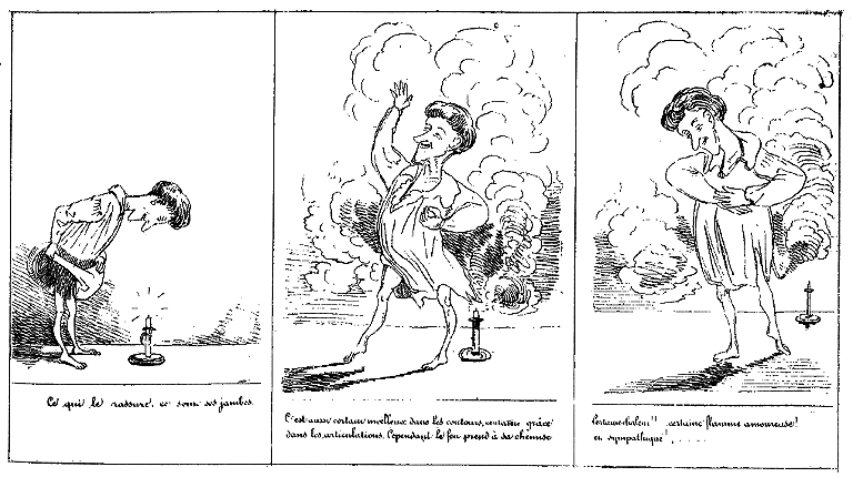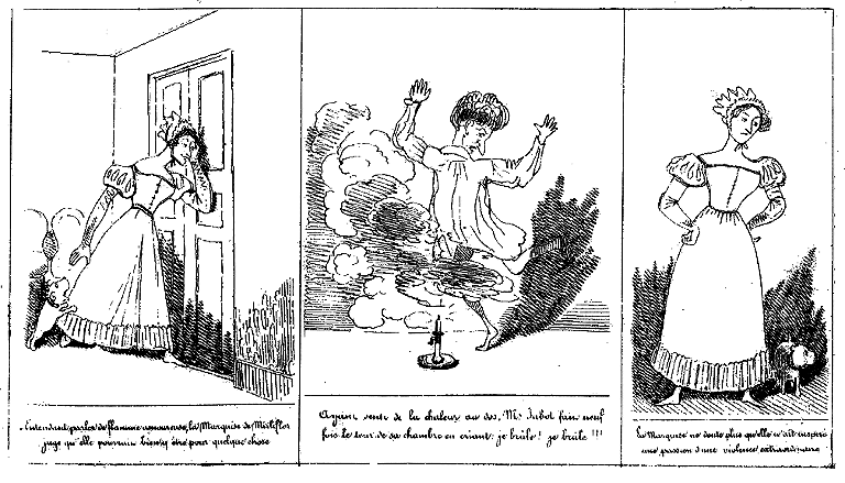| Entendant parler de flamme amoureuse, la Marquise de Mirliflor juge qu'elle pourrait bien y être pour quelque chose. | Ayant senti la chaleur au dos, Mr. Jabot fait neuf fois le tour de sa chambre en criant: Je brûle!... je brûle!!! | La Marquise ne doute plus qu'elle n'ait plus inspiré une passion d'une violence extraordinaire. |
