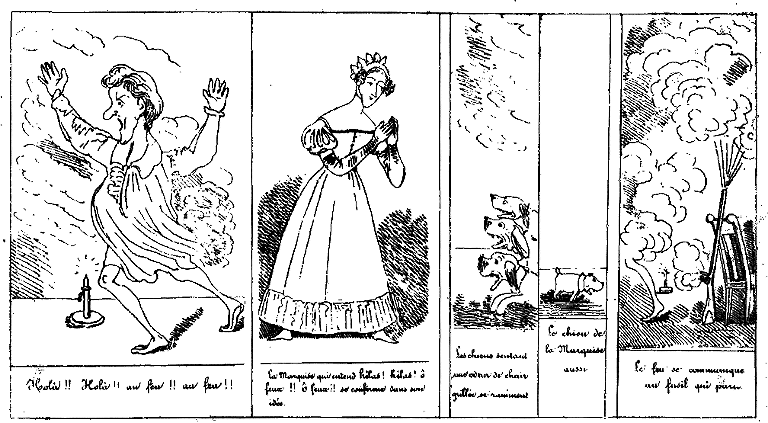 | Holà!! Holà!! Au feu!! au feu!! | La Marquise qui entend: Hélas! Hélas! Ô feux!! ô feux!! se confirme dans son idée. | Les chiens sentant l'odeur de chair grillée se raniment. | Le chien de la Marquise aussi. | Le feu se communique au fusil qui part. |