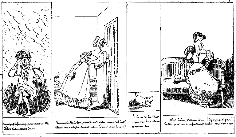 | Cependant la fumée tire des yeux de Mr. Jabor, d'abondantes larmes. | Revenue à elle, la Marquise se hasarde à jeter un coup d'oeil furtif. Elle voit son amant plein de vie et tout en larmes! Douces larmes!!! | Le chien de la Marquise se hasarde à revenir à lui. | Mr. Jabot s'étant écrié: Il y a de quoi périr!! La Marquise en est profondément touchée. Son chien aussi. |