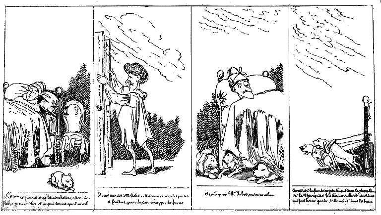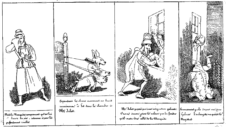 | Guidé par le bruit des chiens, Mr. Jabot retourne à son lit, ravi d'une aventure aussi chevaleresque. | S'étant rendormi, Mr. Jabot rêve qu'il sauve deux beautés mourantes des injustes persécutions d'un trop coupable oppresseur. | La Marquise s'étant levée de bon matin est profondément attendrie à la vue de son libérateur. Toutefois elle ferme la porte. Son chien aussi. |