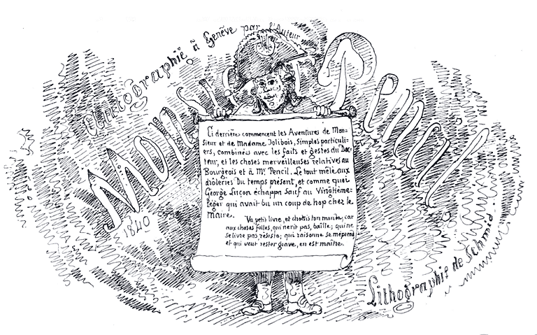 | Mr. Pencil, qui est artiste, dessine la belle nature. | Mr. Pencil, qui est artiste, regarde avec complaisance ce qu'il a fait, et remarque qu'il en est content. | Mr. Pencil, qui est artiste, remarque qu'à rebours il est content aussi. | Et même en regardant par dessus l'épaule. |