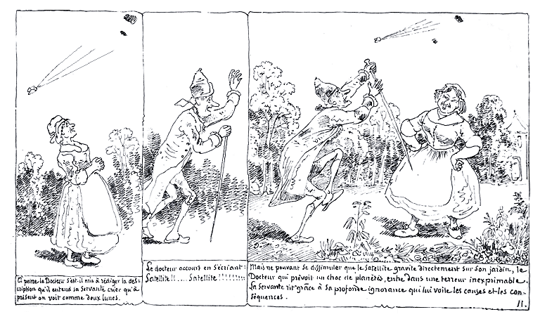 | A peine le Docteur s'est-il mis à rédiger la description qu'il entend sa servante crier qu'à présent on voit comme deux lunes. | Le Docteur accourt en s'écriant: Satellite!!.... Satellite!!!!!!! | Mais ne pouvant se dissimuler que le satellite gravite directement sur son jardin, le Docteur qui prévoit un choc de planètes, entre dans une terreur inexprimable. La servante rit grâce à sa profonde ignorance qui lui voile les causes et les conséquences. |