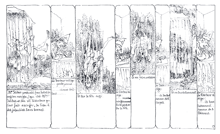 | Mr. Jolibois persuadé (car hélas la passion aveugle,) que c'est Mde. Jolibois et son vil séducteur qui l'on fait encager, se livre à des jalousies sans bornes. | Le Docteur rédige: ... grands jureurs... .................. ..... climat brûlant..... | Et sur la tête aussi. | Le Docteur rédige: .... marchent indifféremment sur les pieds ou sur la tête. | Et en façon natatoire. | Le Docteur rédige: ..... ils sautent comme des carpes. | Et en tourbillonnant. | Le Docteur rédige: .... ils tourbillonnent comme des démons. |
