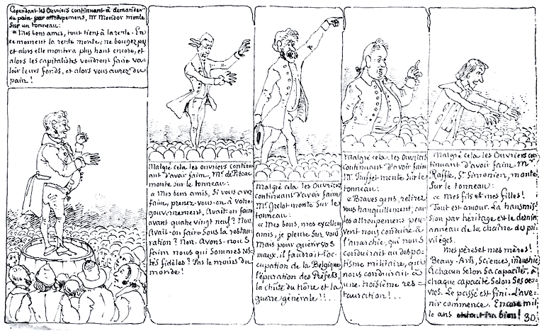 monte sur le tonneau: "Mes fils et mes filles! Tout est amour. Sa transmission par héritage est le dernier anneau de la chaîne des privilèges. Mes pères et mes mères! Beaux-Arts, Sciences, Industrie. A chacun selon sa capacité, à chaque capacité selon ses oeuvres. Le passé est fini. L'avenir commence. Encore mille ans et tout ira bien!" |