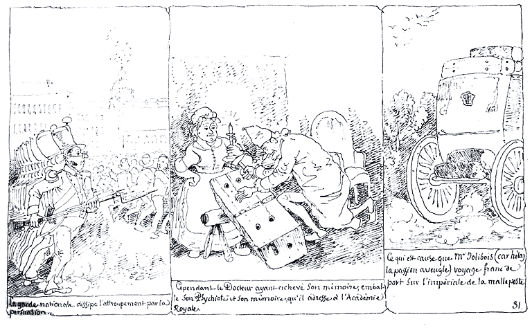 | La garde nationale dissipe l'attroupement par la persuasion. | Cependant le Docteur ayant achevé son mémoire, emballe son Psychiote et son mémoire, qu'il adresse à l'Académie Royale. | Ce qui est cause que Mr. Jolibois (car hélas la passion aveugle) voyage franc de port sur l'impériale de la malle-poste. |