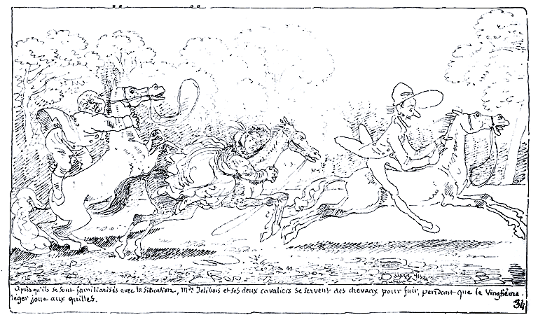 Après qu'ils se sont familiarisé avec la situation, Mde. Jolibois et ses deux cavaliers se servent des chevaux pour fuir, pendant que le Vingtième-léger joue aux quilles.