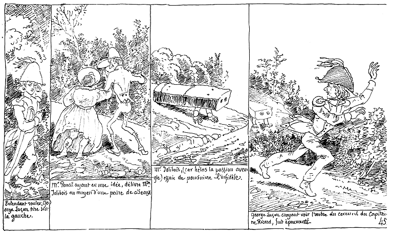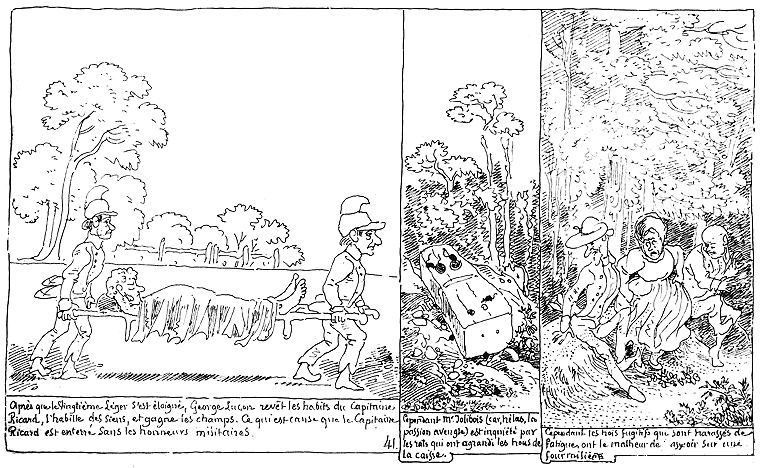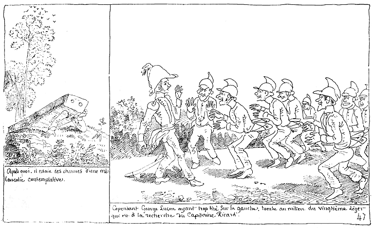 | Après que le Vingtième-léger s'est éloigné, George Luçon revêt les habits du Capitaine Ricard, l'habille des siens, et gagne les champs. Ce qui est cause que le Capitaine Ricard est enterré sans les honneurs militaires. | Cependant Mr. Jolibois (car, hélas, la passion aveugle) est inquiété par les rats qui ont agrandi les trous de la caisse. | Cependant les trois fugitifs qui sont harassés de fatigue ont le malheur de s'asseoir sur une fourmilière. |