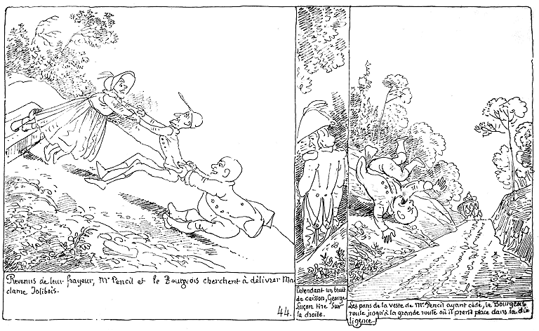 | Revenus de leur frayeur, Mr. Pencil et le Bourgeois cherchent à délivrer Madame Jolibois. | Entendant un bruit de caisson, George Luçon tire sur la droite. | Les pans de la veste de Mr. Pencil ayant cédé, le Bourgeois roule jusqu'à la grande route où il prend place sans la diligence. |