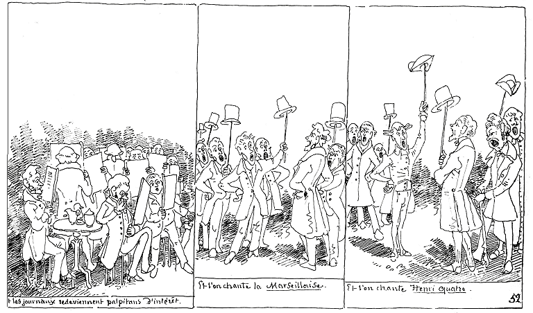 | Et les journaux redeviennent palpitants d'intérêt. | Et l'on chante la Marseillaise. | Et l'on chante Henri quatre. |