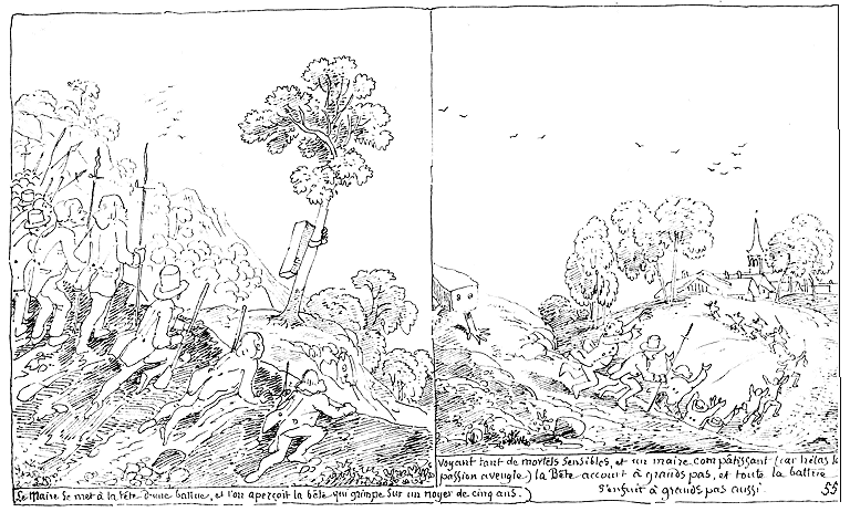 | Le maire se met à la tête d'une battue, et l'on aperçoit la bête qui grimpe sur un noyer de cinq ans. | Voyant tant de mortels sensibles et un maire compatissant (car hélas la passion aveugle) la Bête accourt à grands pas, et toute la battue s'enfuit à grands pas aussi. |