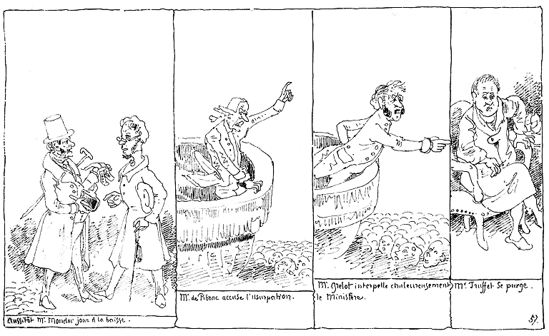 | Aussitôt Mr. Mondor joue à la baisse. | Mr. de Pibrac accuse l'usurpation. | Mr. Grelot interpelle chaleureusement le ministre. | Mr. Truffet se purge. |