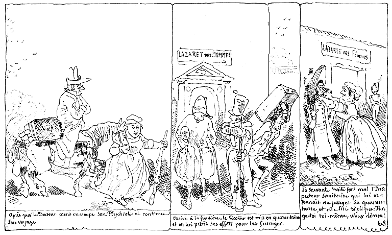 | Après quoi le Docteur prend en croupe son Psychiote et continue son voyage. | Arrivé à la frontière, le Docteur est mis en quarantaine et on lui prend ses effets pour les fumiger. | Sa servante traite fort mal l'inspecteur sanitaire qui lui ordonnait de purger sa quarantaine, et elle lui réplique: Purge-toi toi-même, vieux démon! |