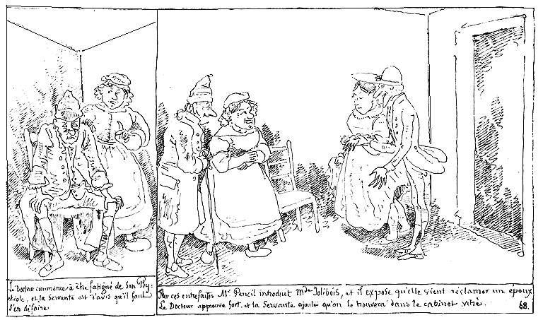| Le Docteur commence à être fatigué de son Psychiote, et la servante est d'avis qu'il faut s'en défaire. | Sur ces entrefaites, Mr. Pencil introduit Mde. Jolibois, et il expose qu'elle vient réclamer un époux. Le Docteur approuve fort, et la servante ajoute qu'on le trouvera dans le cabinet vitré. |