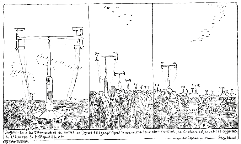 Aussitôt tous les Télégraphes de toutes les lignes télégraphiques reprennent leur état normal, le choléra cesse, et les affaires de l'Europe se tranquillisent.
