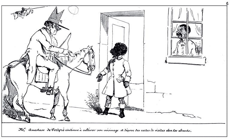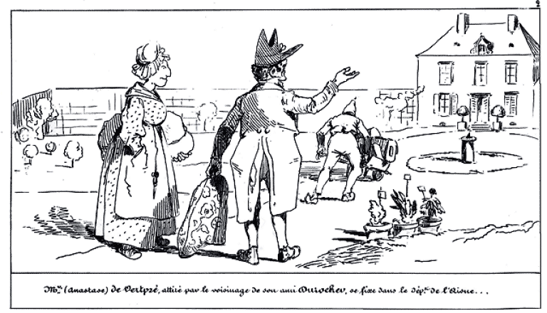 | Mr. (Anastase) de Vertpré, ayant consacré une partie de son existence au service de l'état, juge à propos de quitter la capitale pour se livrer aux douceurs de la vie champêtre, | sa ménagère le suit. |