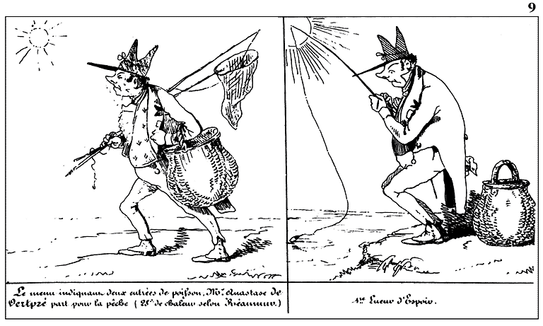 | Le menu indiquant deux entrées de poisson, Mr. Anastase de Vertpré part pour la pêche (28º de chaleur selon Réaumur). | 1re lueur d'espoir. |