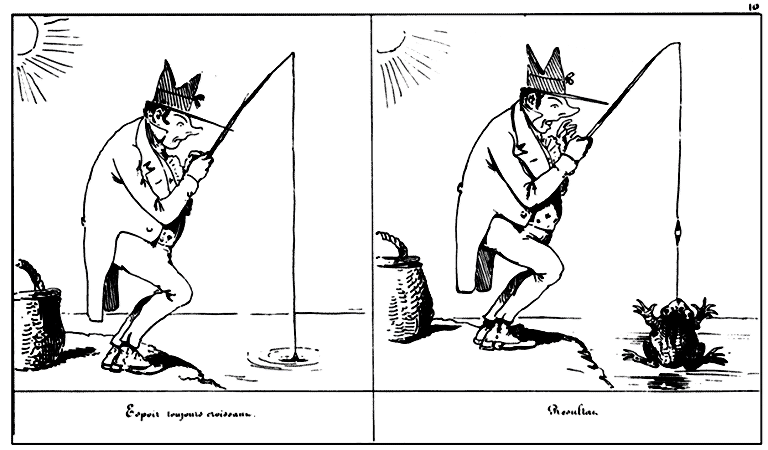 | Mr. Anastase de Vertpré se demande si c'est bien là un poisson. | Penchant pour la négative Mr. Anastase de Vertpré ne se sent pas le courage de tenter le sort de nouveau. |