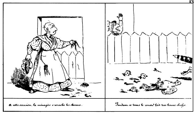 | A cette occasion, la ménagère s'arrache les cheveux. | Pendant ce temps le renard fait très bonne chasse. |