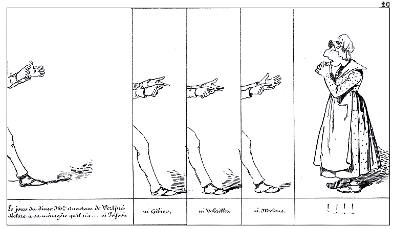 | Le jour du dîner, Mr. Anastase de Vertpré déclare à sa ménagère qu'il n'a .... ni poisson, | ni gibier, | ni volailles, | ni melons. | !!!! |