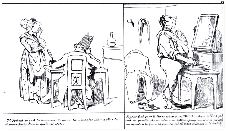 | Il devient urgent de recomposer le menu: la ménagère qui n'a plus de cheveux, tâche d'avoir quelques idées. | Le jour fixé pour le dîner est arrivé, Mr. Anastase de Vertpré tout en procédant avec ordre à sa toilette, essaye un sourire expressif qui réponde à la fois à sa position sociale et aux exigences de la civilité. |