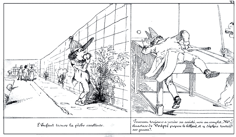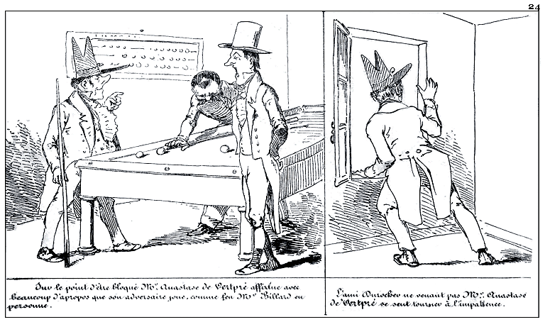 | Sur le point d'être bloqué Mr. Anastase de Vertpré affirme avec beaucoup d'à propos que son adversaire joue comme feu Mr Billard en personne. | L'ami Durocher ne venant pas Mr. Anastase de Vertpré se sent tourner à l'impatience. |