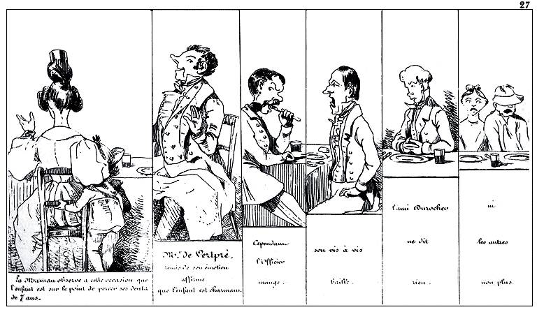 | Les crèmes ayant tournées, Mr. Anastase de Vertpré chante au dessert, et porte un toast au beau sexe en général et aux femmes en particulier, | ce qui effraye l'enfant. | La maman affirme que cela tient aux dents de 7 ans. |