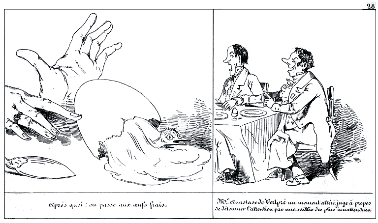 | Après quoi on passe aux oeufs frais. | Mr. Anastase de Vertpré un moment altéré, juge à propos de détourner l'attention par une saillie des plus inattendues. |