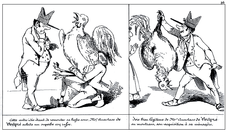 | Cette autre idée étant de remonter sa basse cour, Mr. Anastase de Vertpré achète un superbe coq russe. | Joie bien légitime de Mr. Anastase de Vertpré en montrant son acquisition à sa ménagère. |