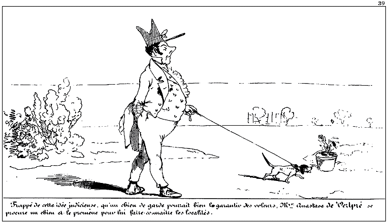 Éclairé par la mort affreuse de son chien de garde, Mr. Anastase de Vertpré a l'heureuse idée de se munir de deux chiens de haute taille: il les promène pour leur faire connaître les localités.