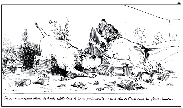 | Réduit à passer la nuit dans son antichambre, Mr. Anastase de Vertpré s'emploie à chercher un expédient pour se débarrasser de ses chiens de haute taille sans trop de désavantage. | Les chiens évitent à Mr. Anastase de Vertpré la peine de trouver l'expédient; la ménagère et la basse cour en éprouvent quelque dommage. |