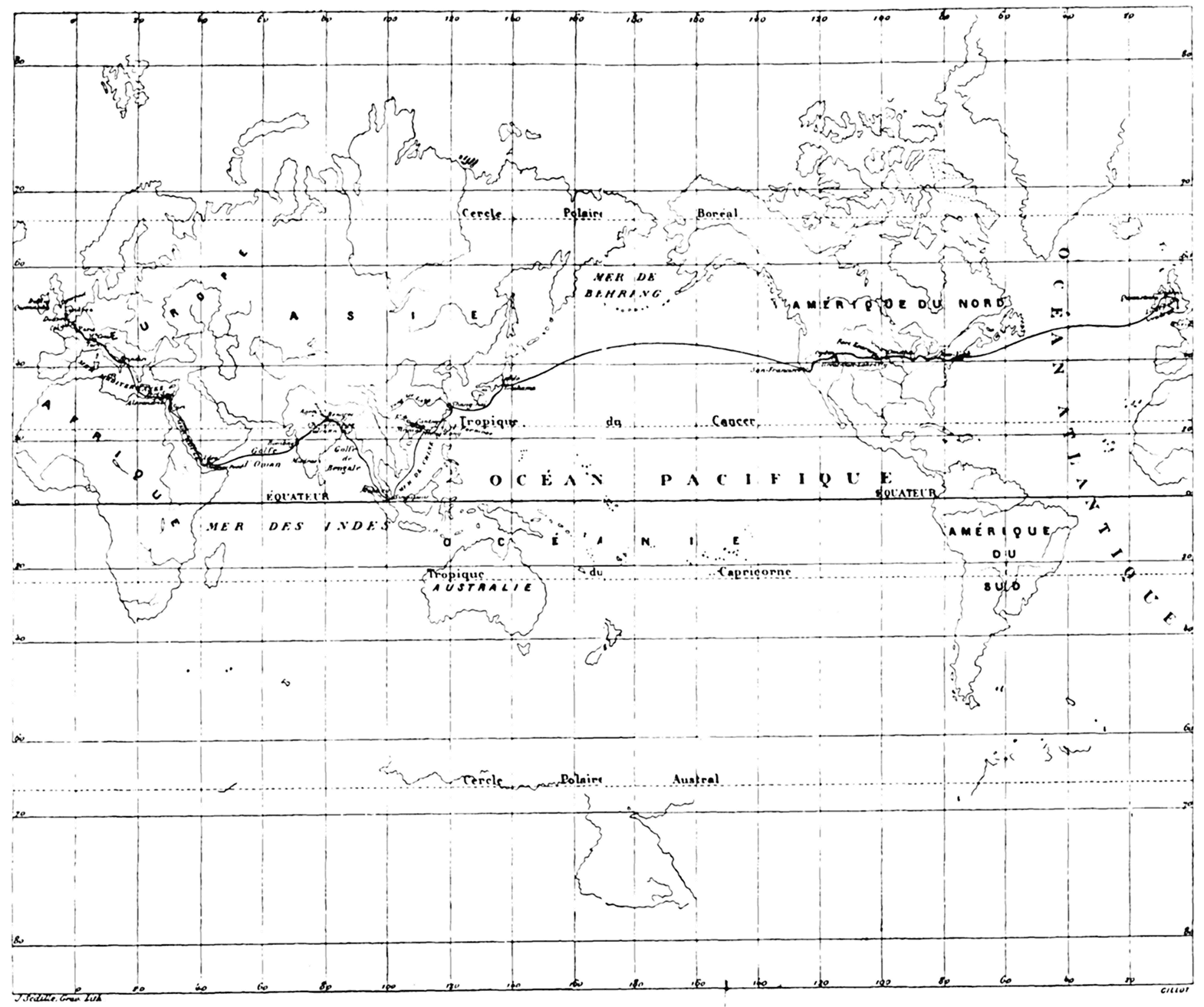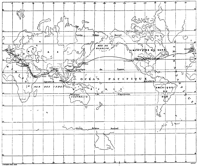 De Londres à Suez par le Mont-Cenis et Brindisi, railways et paquebots De Suez à Bombay, paquebot De Bombay à Calcutta, railway De Calcutta à Hong-Kong (Chine), paquebot De Hong-Kong à Yokohama (Japon), paquebot De Yokohama à San-Francisco, paquebot De San-Francisco à New-York, railroad De New-York à Londres, paquebot et railway. |