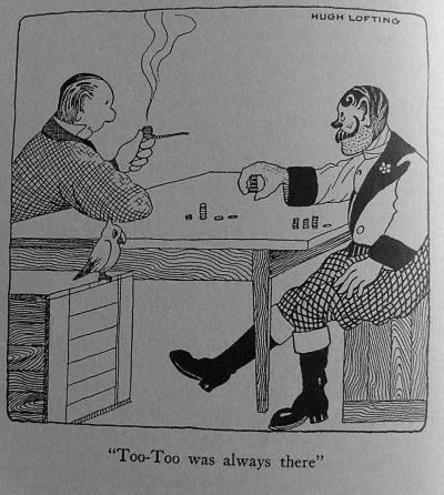 Too-Too, the expert accountant, was busier now than he had ever been. For not only did he keep record of how much the pushmi-pullyu made, but he kept the books for the whole circus. This, with the Doctor's new "coöperative*" arrangement, was no easy task. Strict account of all money paid out to tradespeople had to be carefully entered, and the profits left divided among all the people of the circus in proportion to the amount of work they did. For instance, some of the tent-riggers and wagon-drivers who really only worked one or two days a week did not get so large a share as the side-show performers who were at work all the week. But every one got more when business was good, and less when it was bad.