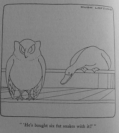 John Dolittle's chief occupation in his spare time was, as I have told you, thinking out new and interesting animal shows. And in doing this he always kept the children particularly in mind as an audience, and designed his plays and entertainments more for them than for the grown-ups. The success of the Talking Horse and the Puddleby Pantomime showed him that his knowledge of animal languages could be put to great use here. The snakes which he had bought from Fatima, for example, were later trained by him to give a little show of their own. Instead of a snake-charmer's tent with a stupid fat woman in it, pretending to be something that she wasn't, the Dolittle Circus had a side show where the snakes gave their own performance, entirely unaided by any person. To the tune of a music box they danced a very peculiar but graceful sort of dance. It was something like a mixture between a quadrille and a game of cat's cradle. On a little stage of their own they glided about on their tails in time to the music, bowing to their partners, doing the grand chain, looping into knots with one another, drilling like soldiers and doing a hundred fascinating things that people had never seen snakes do before.