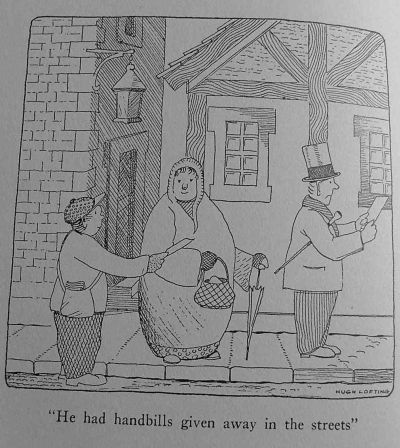 For the same reason, to avoid getting into debt, the Doctor decided not to move back to Manchester, but to keep the show where it was for the present. And with better weather the attendance soon began to be quite considerable. Mr. Bellamy's arrival and his visit to the tradespeople of the town were a good advertisement for the Dolittle Circus. Another advertisement better still was, curiously enough, Blossom's theft and disappearance. No sooner had it become known in Manchester that the ringmaster had run away with a large sum of money than the newspapers took it up and wrote long stories of how the famous Puddleby Pantomime had been robbed and left stranded in a small town twelve miles from the city. The story was reprinted in country papers. And suddenly the people of this same small town woke up to the fact that they had the Puddleby Pantomime in their midst and hadn't noticed it (on account of the rain) till they read of it in the papers.