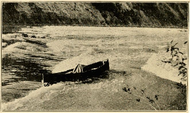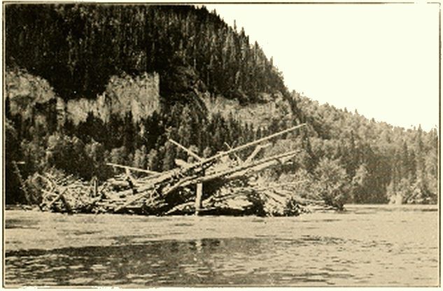 The settlement at the lower end of the lake is afflicted with the name of Saw Ridge, pronounced of course to rhyme with porridge. The change here was even more striking than at Grouard. Five years ago Tom Lilac's two little log shacks crouched alone among the sand dunes. Now there are three modern stores, a telegraph office, and a cable ferry. We had a sad sense that civilization was getting an inexorable grip on us, and we lingered no longer than was necessary to buy grub and to inquire about the steamboat. We learned that she had lain at Saw Ridge all night, and our friends were only an hour or two ahead of us on the river.
