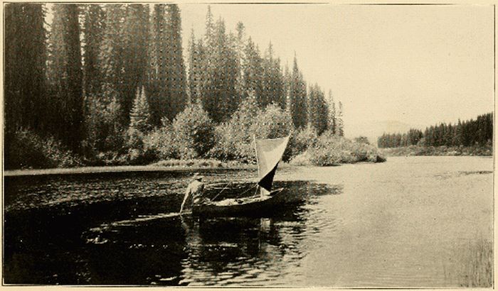 Next morning we were on our way before our kind hosts were astir. We felt the usual embarrassment about offering pay for our entertainment, but in this case we got around it by leaving some shells which fitted the young man's rifle. The day broke clear and cold. We made famous speed with the current, and pricked off our progress on the map at a highly encouraging rate. What I have already said of the river applies to this day too. We rounded innumerable pine-clad points, and traversed one long reach after another. The glory of the autumn tints was fast departing, for the poplars were shedding their leaves. There were several so-called rapids en route, but some of them were scarcely discernible.