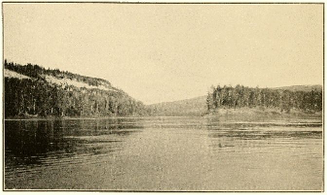 We went down fast enough, but such were the capricious excursions of the stream that progress in a given direction was slow indeed. In one spot near the lake, with a few days' digging some years ago, they broke through to the next bend and saved going round half mile. The wind was still blowing hard, and it played tag with us on the river, swooping on us from a new quarter at every bend. Marten Mountain was still with us, now on our right hand, now on the left. I have not mentioned the exceptional beauty of these distant hills in the clear, bright air of the North. They bask in the sunlight like yellow and blue gardens.