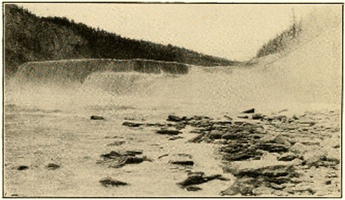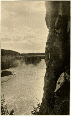 The rapids followed. As usual we had been warned against them, but they proved to be mere child's play after what we had been through. Since the last time I descended these rapids the government has built many wing dams to assist navigation. These are breakwaters extending out from the shore to force the current into a[262] narrow, deep channel. The water cascades through like a gigantic mill-race, but it is perfectly simple to run them; you simply let her go down the channel marked out for you. Building these dams has had the effect of backing up the water between the rapids, and there were long slack stretches that made tedious paddling. The rapids could not come often enough to please our impatient souls.